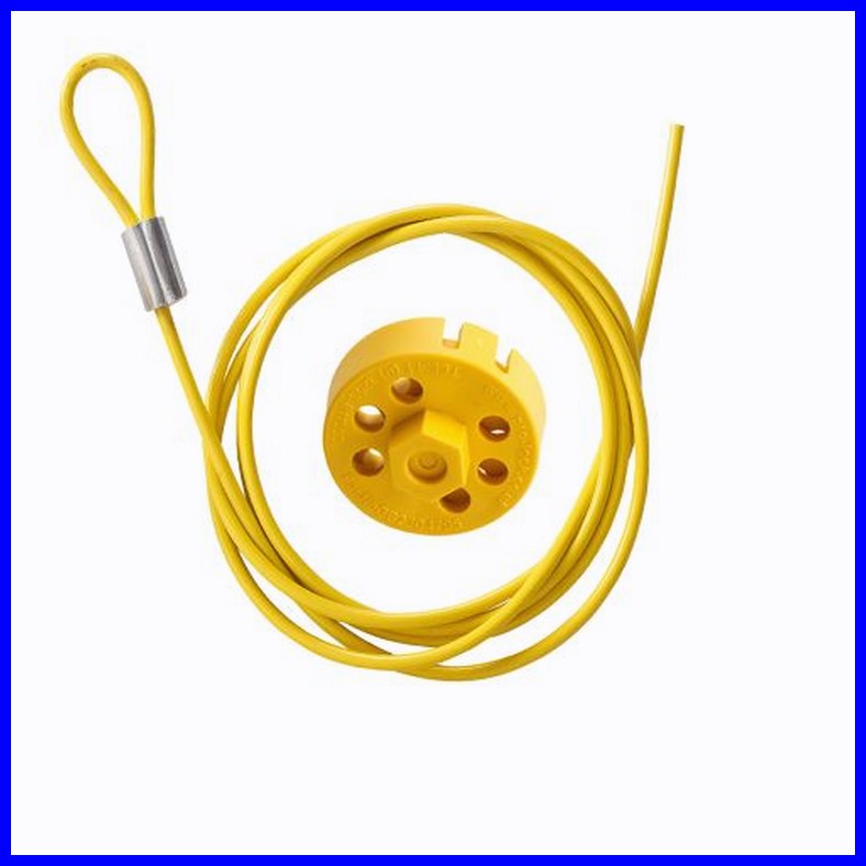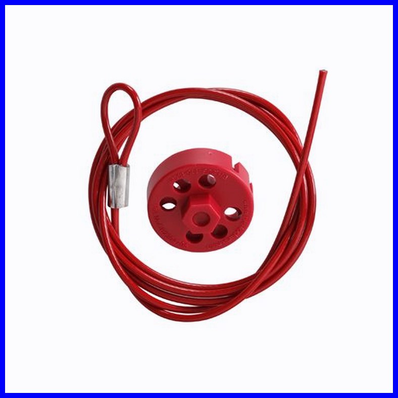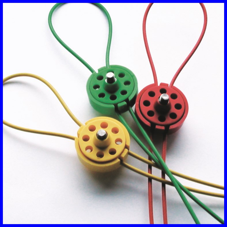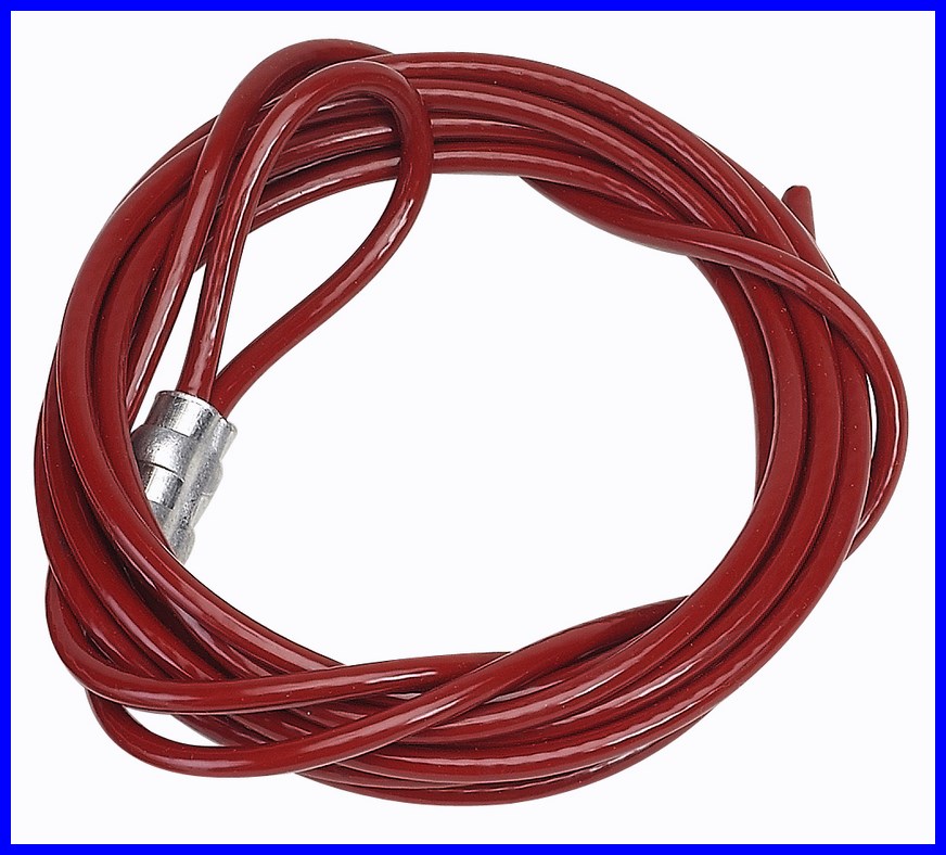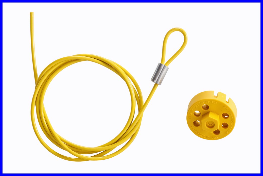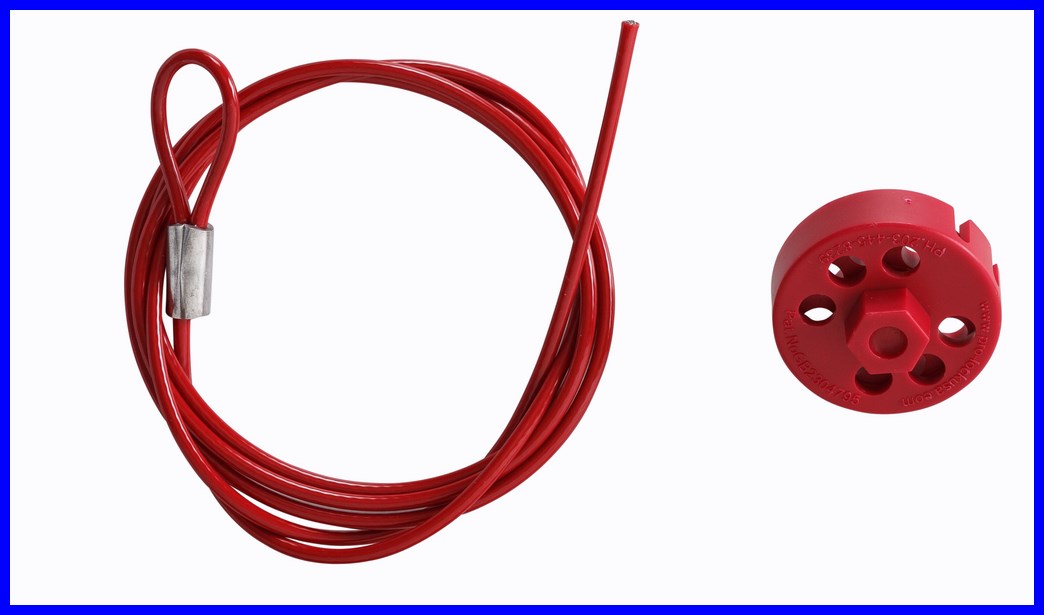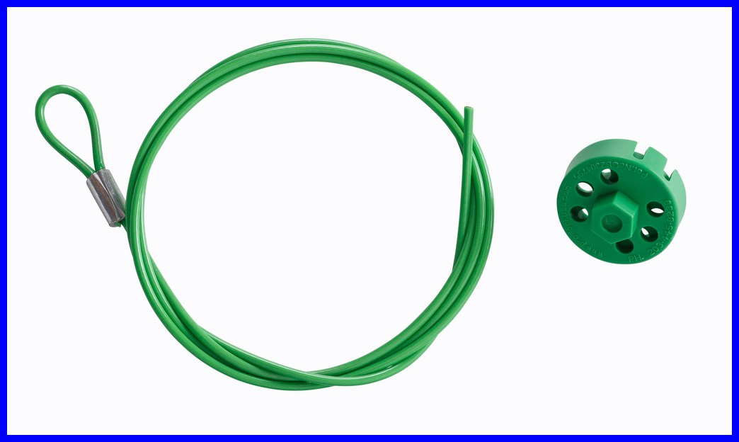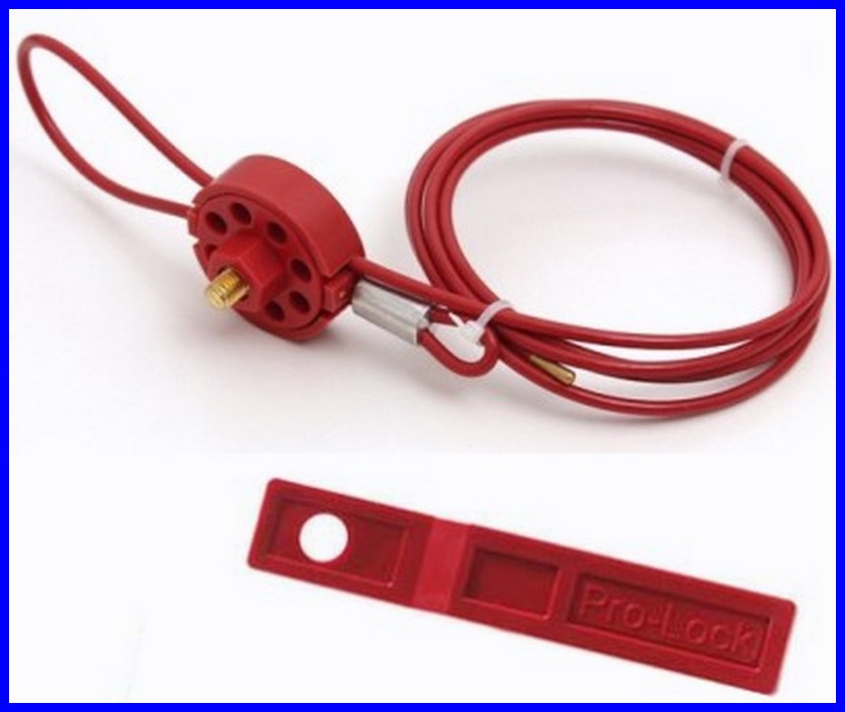 Komplet blokady Brady Pro-Lock II składa się z zestawu: blokada + linka ze stali nierdzewnej pokryta PVC o długości 1,5 m i średnicy 3,5 mm.