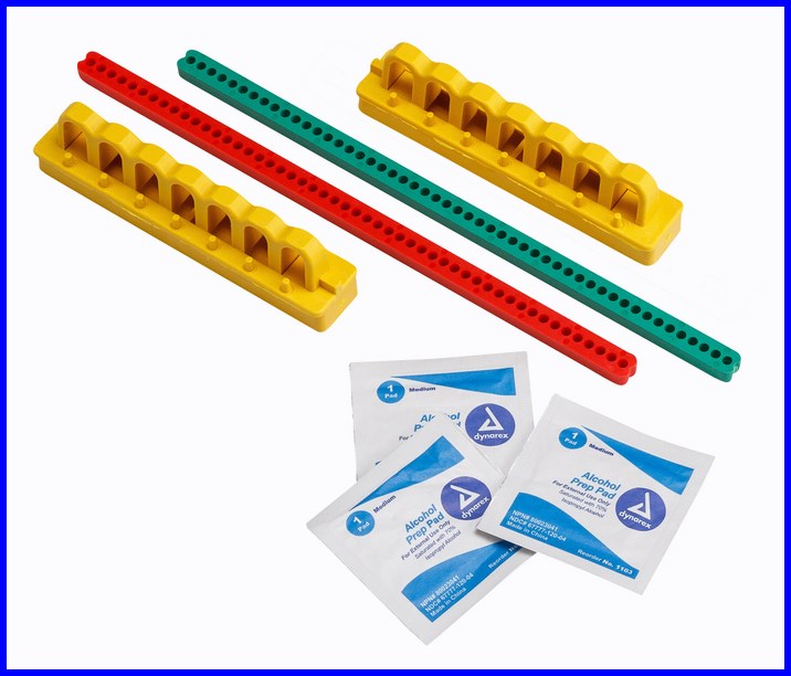Każdy zestaw zawiera: 2 żółte szyny montażowe, 1 czerwony pręt blokujący, 1 zielony pręt blokujący i 3 chusteczki nasączone alkoholem do przygotowania powierzchni przed naklejeniem blokady.