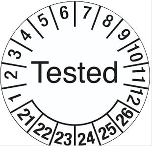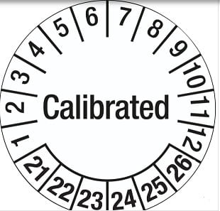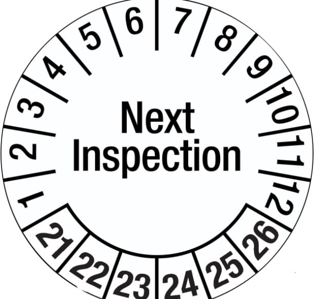 Wzór etykiety: Next inspection, Calibrated, Tested, Serviced.