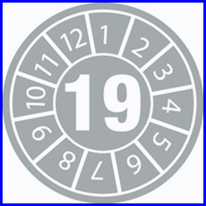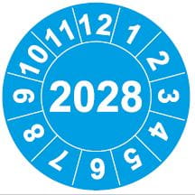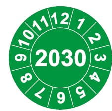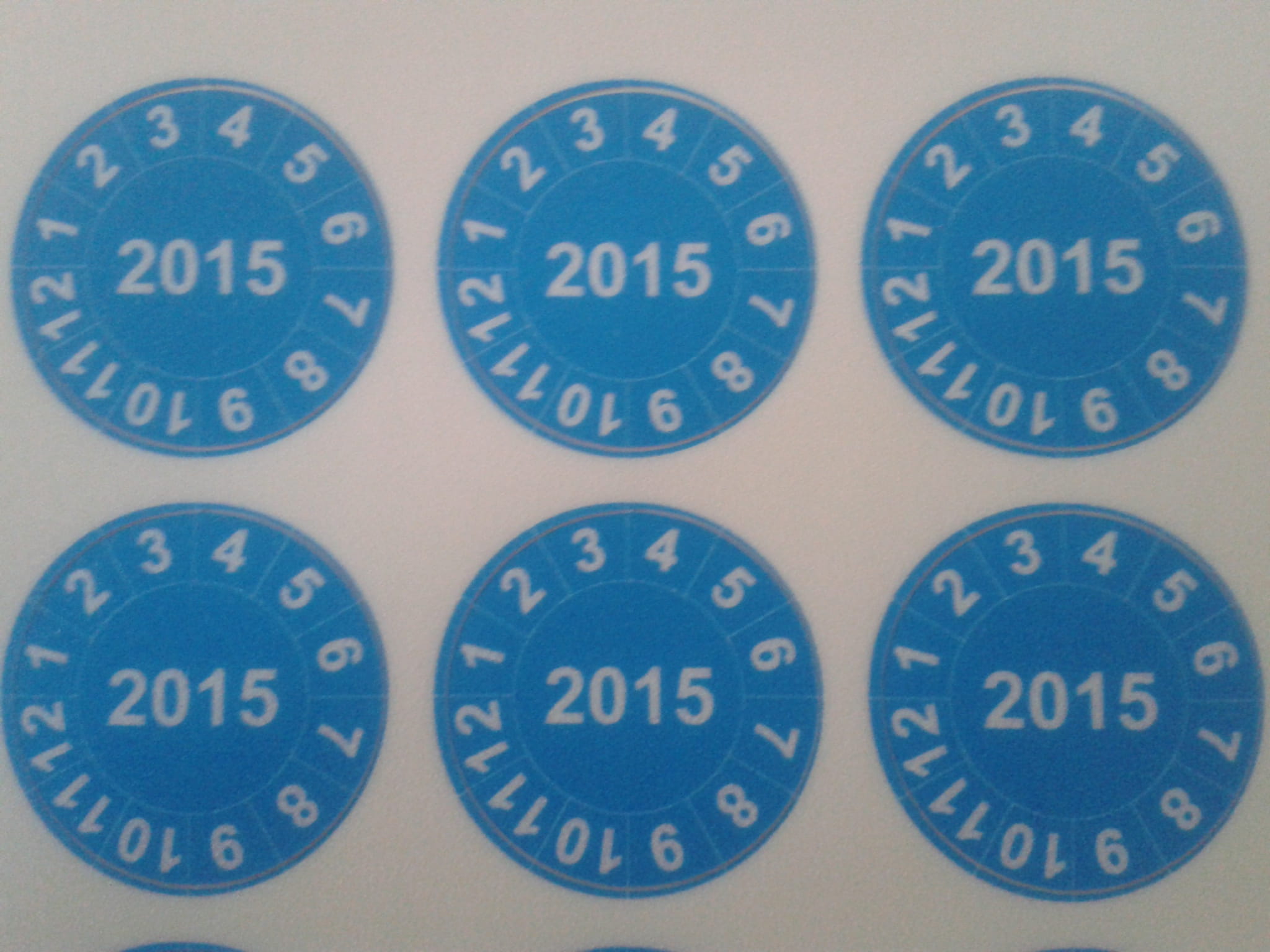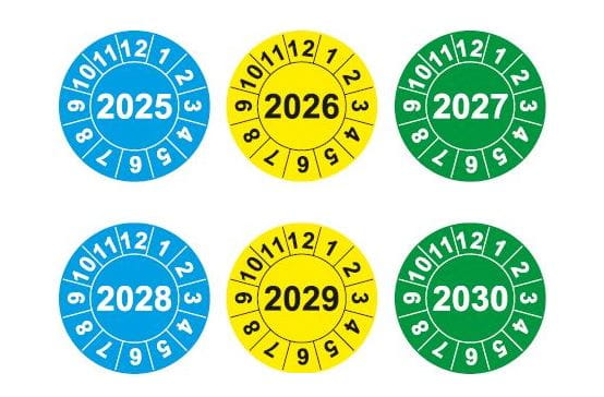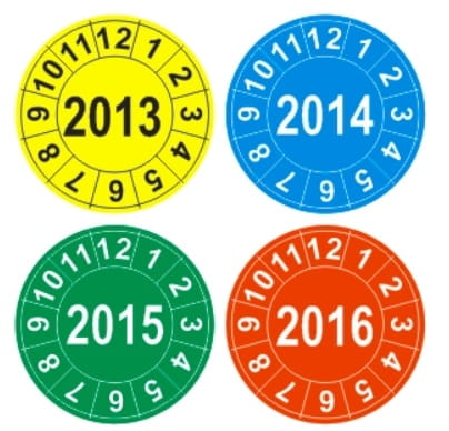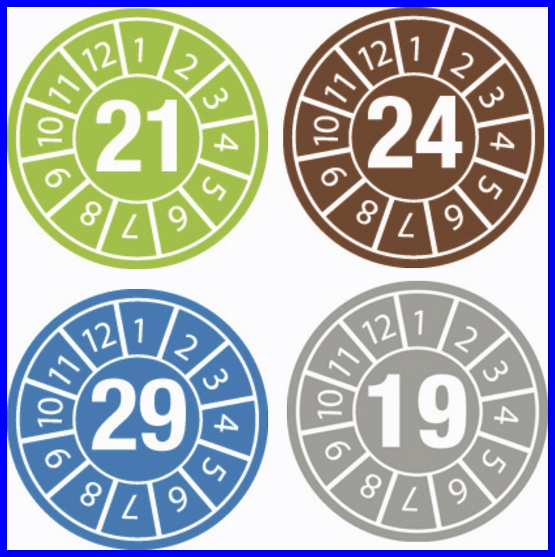 Naklejki inspekcyjne, kalibracyjne do oznaczania dat kontroli i terminów przeglądów, do inspekcji, kalibracji, oznakowania narzędzi, w postaci samoprzylepnych, okrągłych etykiet.
