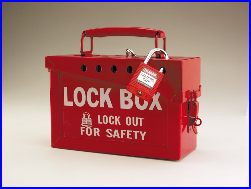 Napis w języku angielskim: LOCK BOX LOCK OUT FOR SAFETY